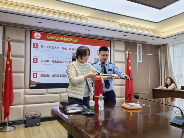 活动中,王诗杰教官结合近年典型火灾案例,深入剖析了办公场所常见火灾隐患,重点讲解了电器安全使用、初期火灾扑救及逃生自救技巧。通过图文并茂的PPT和互动问答,参训人员深刻认识到“隐患险于明火,防范胜于救灾”的重要性。随后,王教官现场演示了干粉灭火器、消防面罩的正确操作方法,并组织进行实操演练,确保人人掌握“提、拔、握、压”灭火要领。